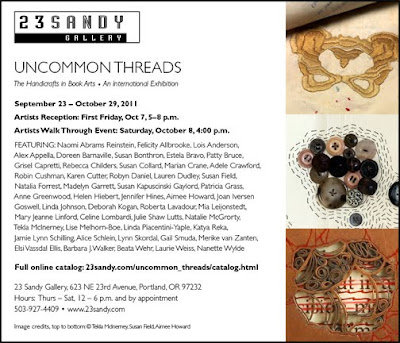 Uncommon Threads: Handicrafts in Book Arts opens at 23 Sandy Gallery in Portland, OR on September 23 and runs through October 29. There is an Artists Reception on Friday, October 7 from 5-8 pm and an Artist Walk Through Event on Saturday, October 8 at 4 pm. The gallery hours are Thursday through Saturday from 12-6 pm and by appointment.
