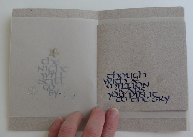 I came across this little book of the poem, The Night Will Never Stay, by Eleanor Farjeon when cleaning out some of the drawers in the studio. When I taught an Introduction to Calligraphy class many years ago at Rivier College (now University), the project assignment for Uncial was a simple book. This was one of my samples. Some of the stars are missing. I think these were the old style ones that you licked to stick.